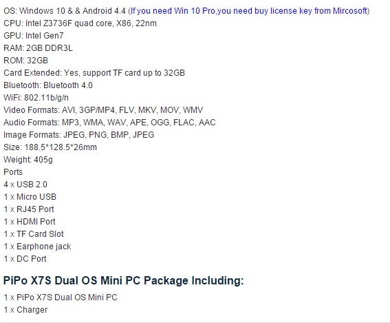 Android box Pipo X7S sử dụng song song 2 hệ điều hành Win10 và Android 4.4. Với chip xử lý Intel Z3736F 64bit, 32GB ROM và 2GB RAM.