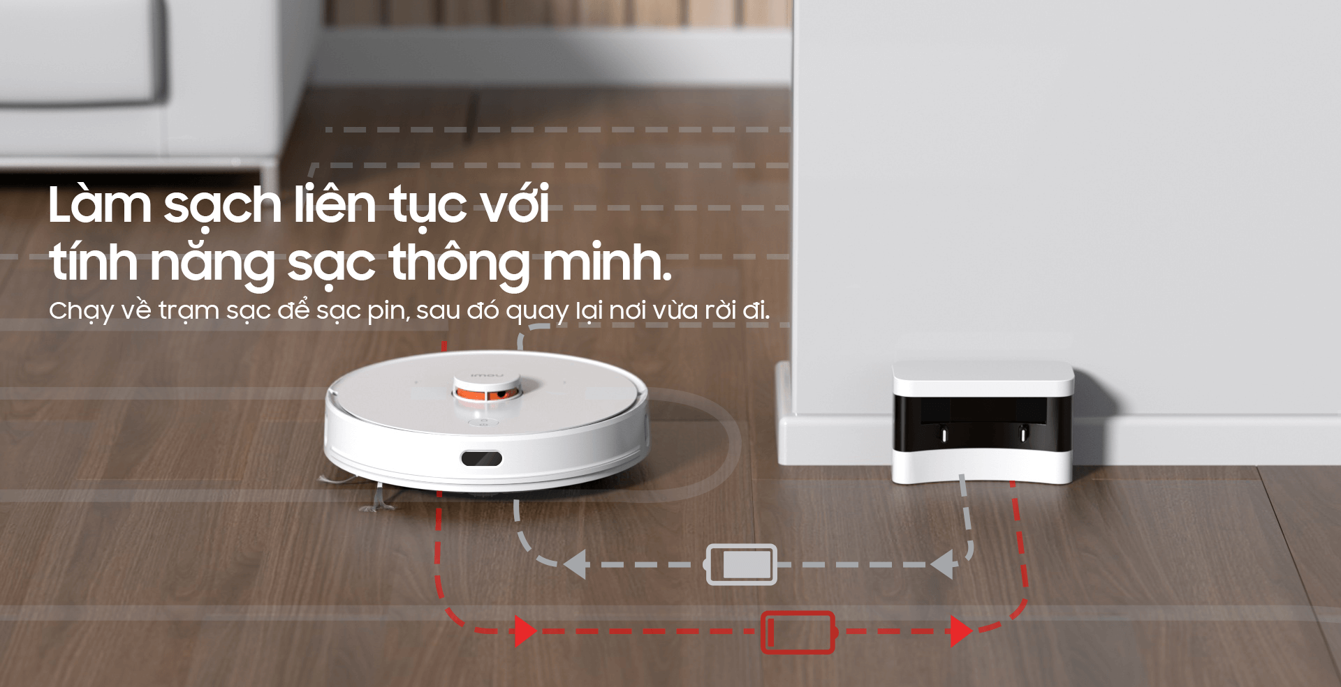 - Robot thông minh sẽ đi sạc rồi sau đó quay lại vị trí cũ tại thời điểm báo pin yếu để tiếp tục làm việc.