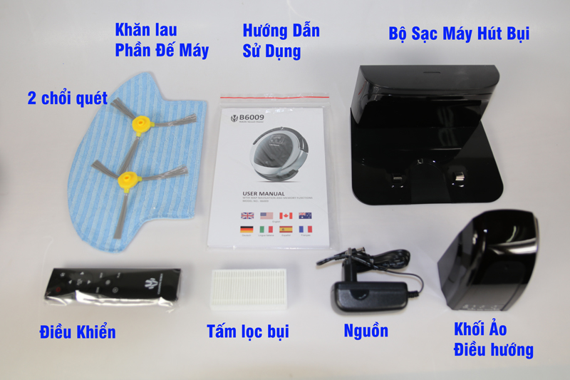 Phụ kiện đi kèm trên Liectroux B6009: Bộ sạc máy hút bụi, khối ảo điều hướng, nguồn, tấm lọc bụi, điều khiển, 2 chổi quét 2 bên, khăn lau tại phần đế máy, hướng dẫn sử dụng.
