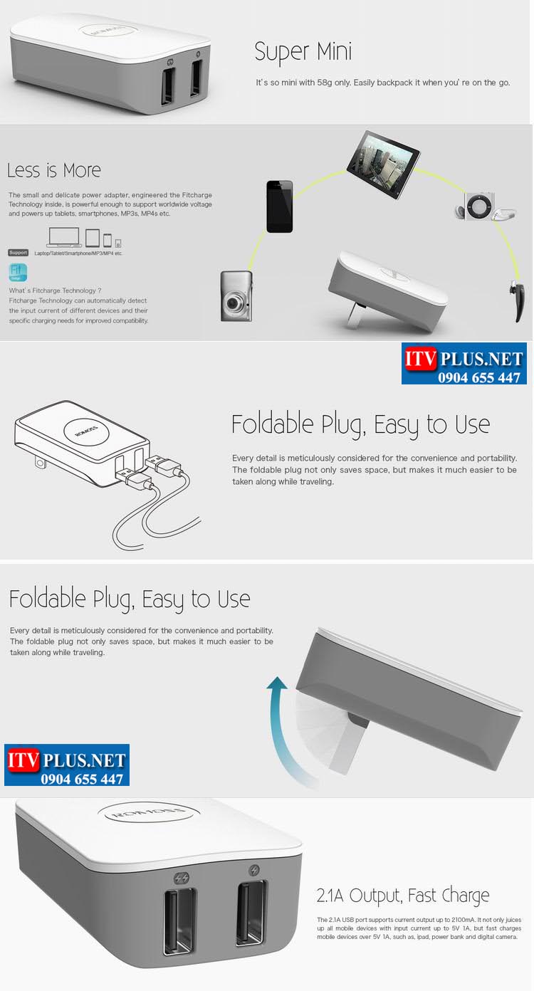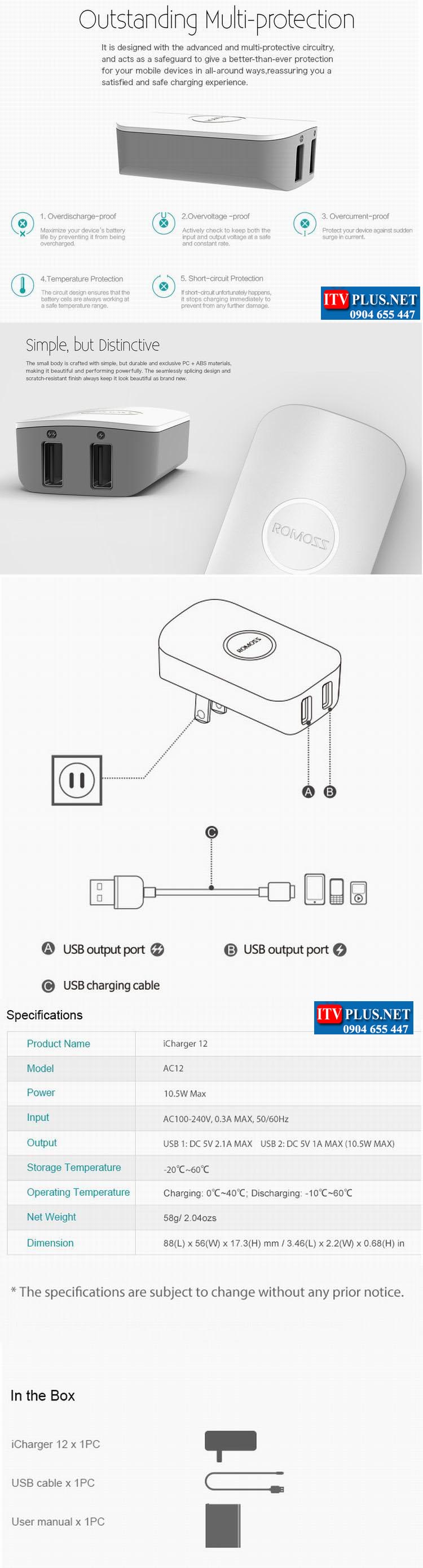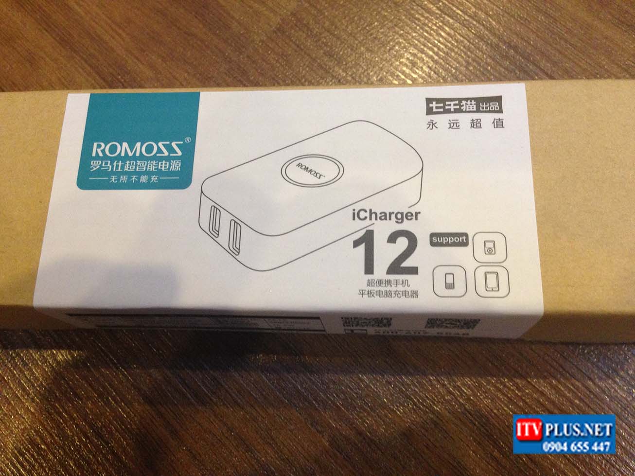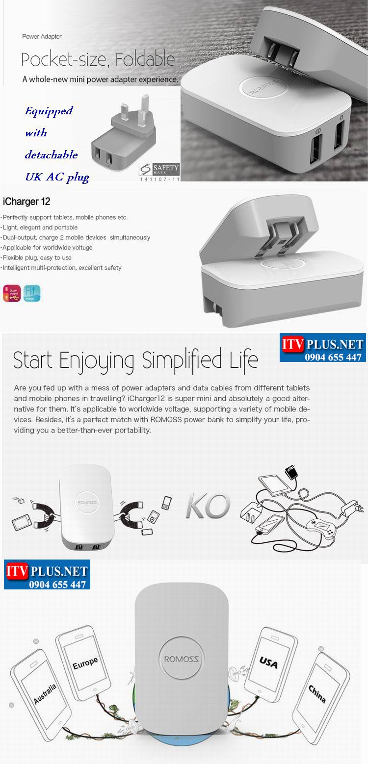 Sạc cao cấp thông minh iCharger12 Romoss , với 2 cổng USB output.