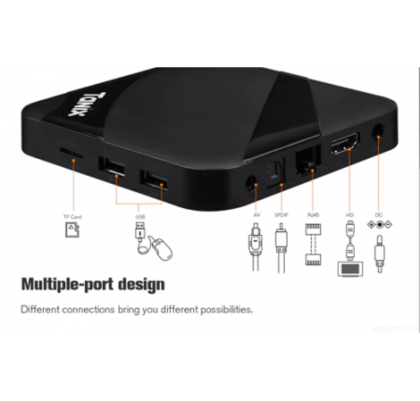 Các cổng kết nối in/out: AV, CVBS/L/R, DC Power Port ,HDMI ,Optical, RJ45, SPDIF, TF card, USB2.0