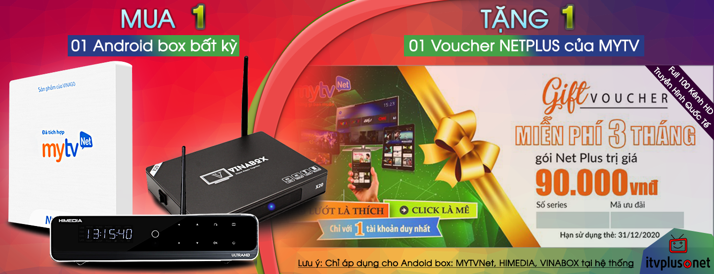Đặc biệt, khi mua Androi Box do VINAGO phân phối, Quý khách hàng sẽ được tặng ngay 1 voucher NETPLUS của MYTV Full 100 Kênh HD Truyền Hình Quốc Tế 03 Tháng trị giá 90.000đ .