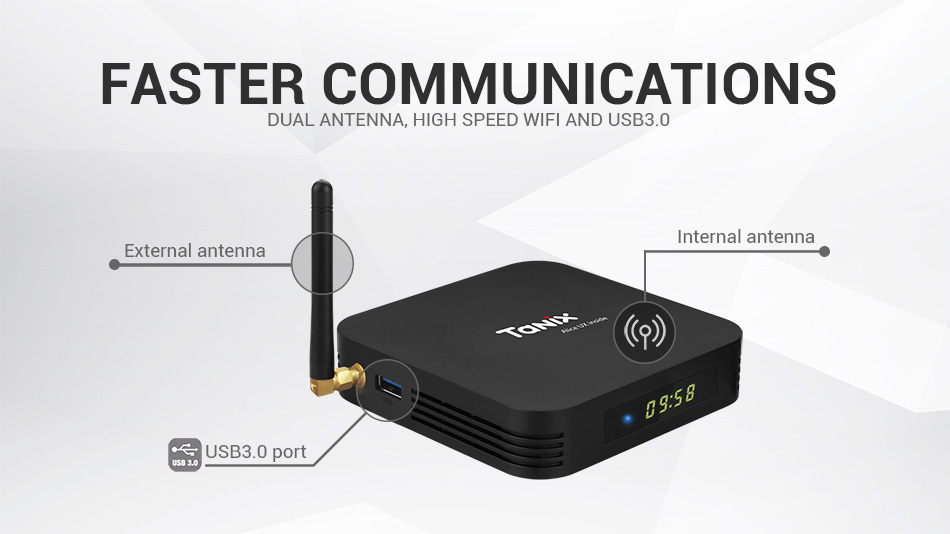 Tanix TX6 thực sự là một khẩu pháo hạng nặng trong số những Android Box giải trí tầm trung. Được trang bị đến 4GB Ram và 32GB bộ nhớ trong, có thể mở rộng bằng khe gắn thẻ nhớ lên đến 32GB nên TX6 xử lý những tác vụ mạnh và đa nhiệm hết sức mượt mà, trơn tru. Được trang bị đến 2 antena wifi ( một trong và một ngoài ), wifi 2 băng tần công nghệ Mimo rất chất lượng trong việc thu phát sóng. Ngoài ra TX6 cũng được trang bị cổng USB chuẩn 3.0 giúp cho giao thức kết nối và truyền tải dữ liệu nhanh gấp 10 lần so với chuẩn 2.0.