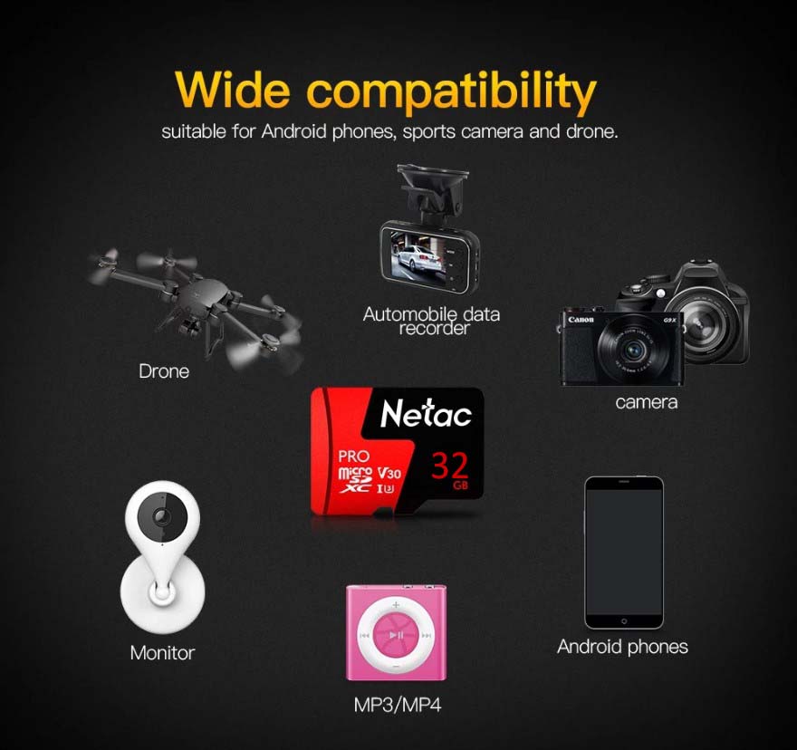 Tương thích với mọi thiết bị như điện thoại thông minh, máy tính bảng và máy ảnh, camera, camera hành trình và thiết bị ghi hình yêu cầu chuẩn tốc độ cao cho độ phân giải 4K, 2K.