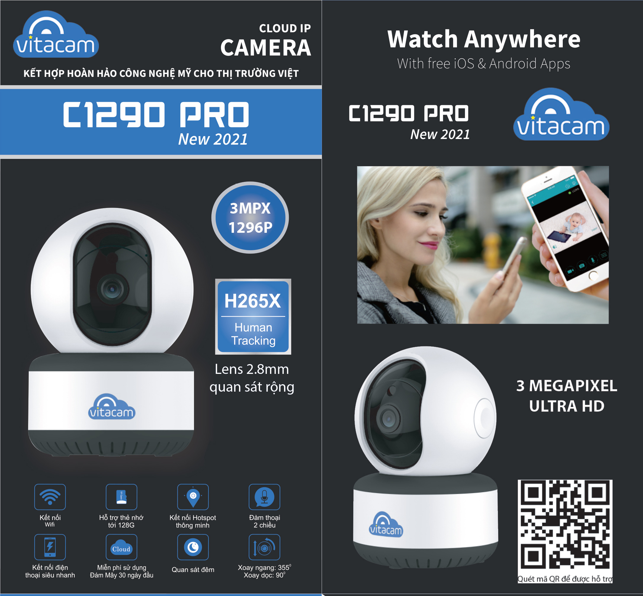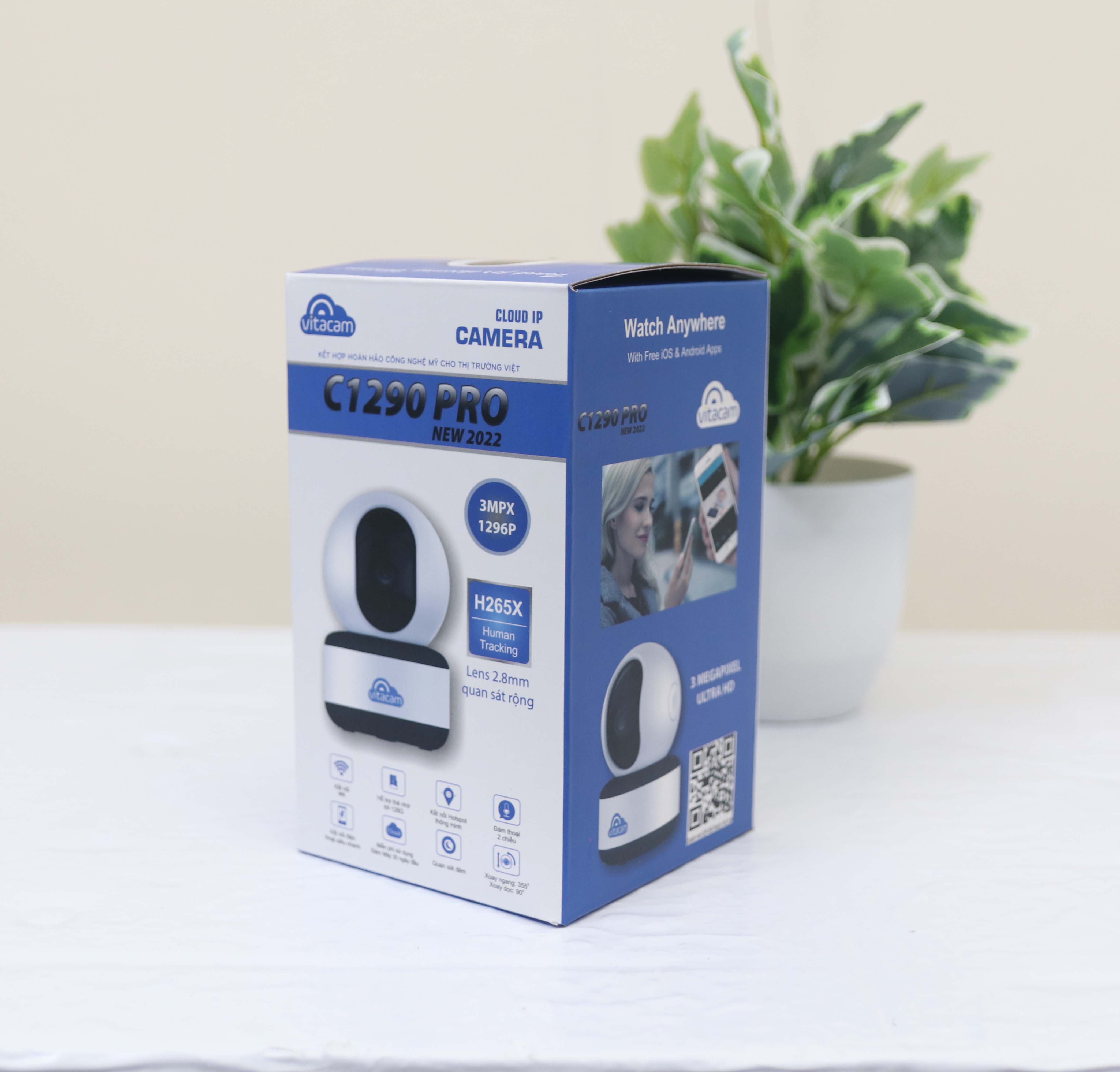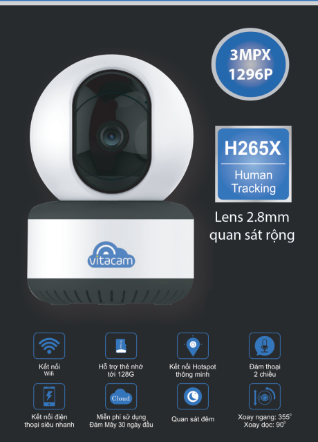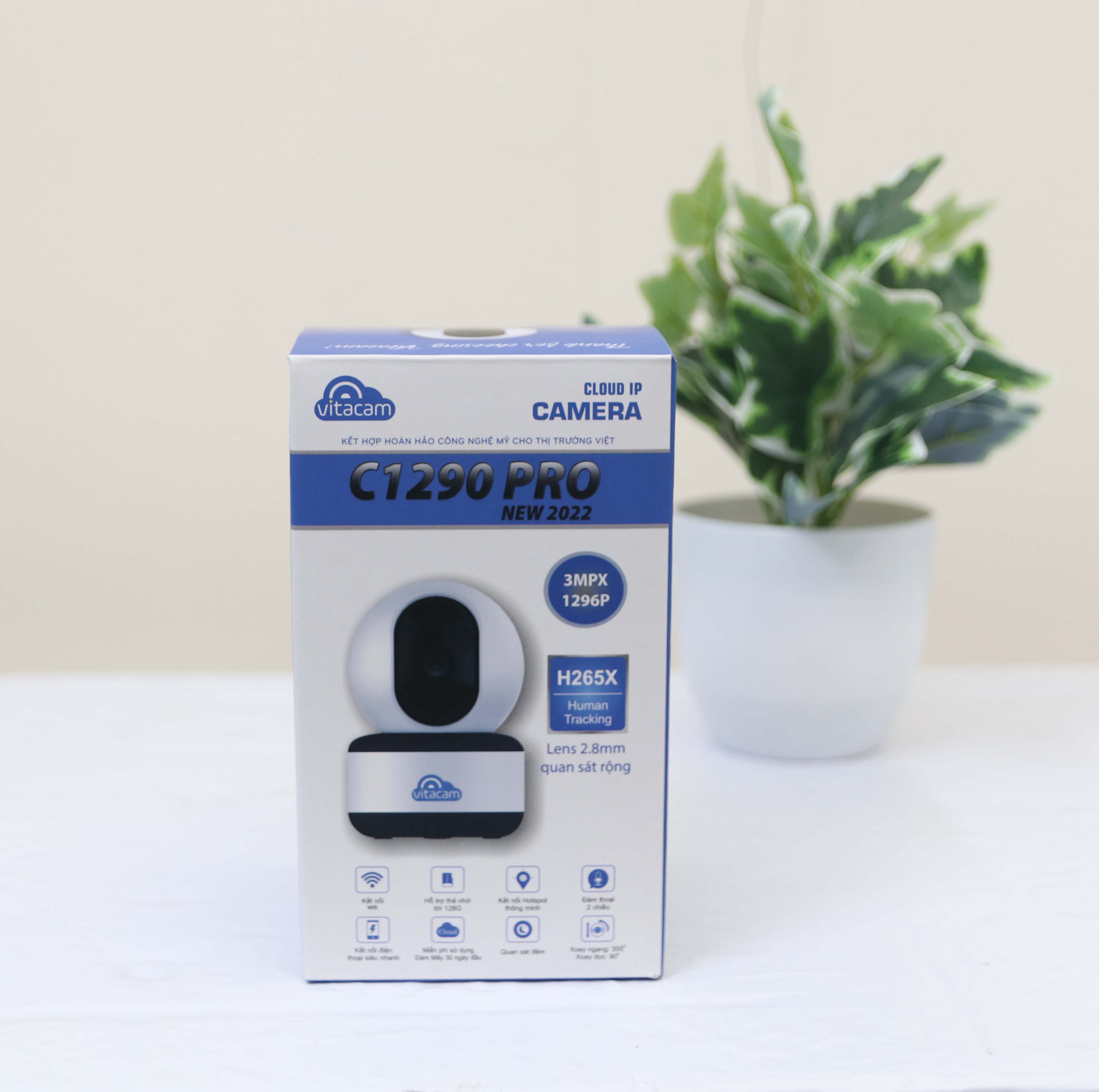 VITACAM C1290 PRO thế hệ mới 2022 với Độ phân giải 3MPX chuẩn Ultra HD - lens 2.8mm góc quan sát siêu rộng, quan sát ban đêm, xoay 360 độ, đàm thoại hai chiều, human tracking.