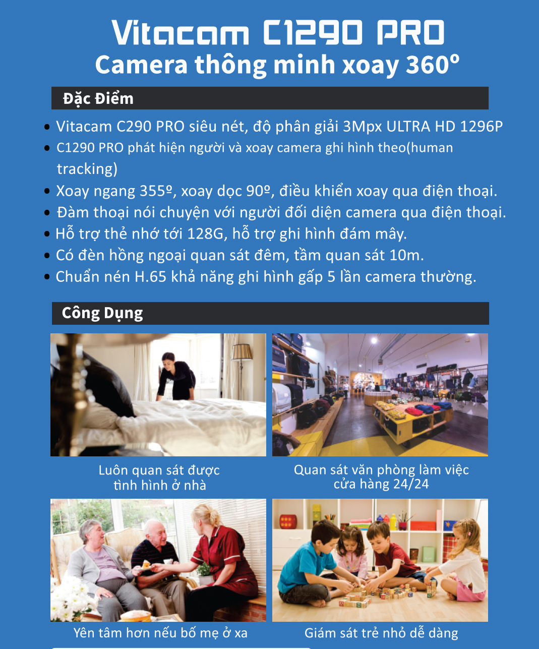 - VITACAM C1290 PRO thuộc dòng cam quay quét 360 độ cung cấp phạm vi bao phủ với trường nhìn mở rộng.
